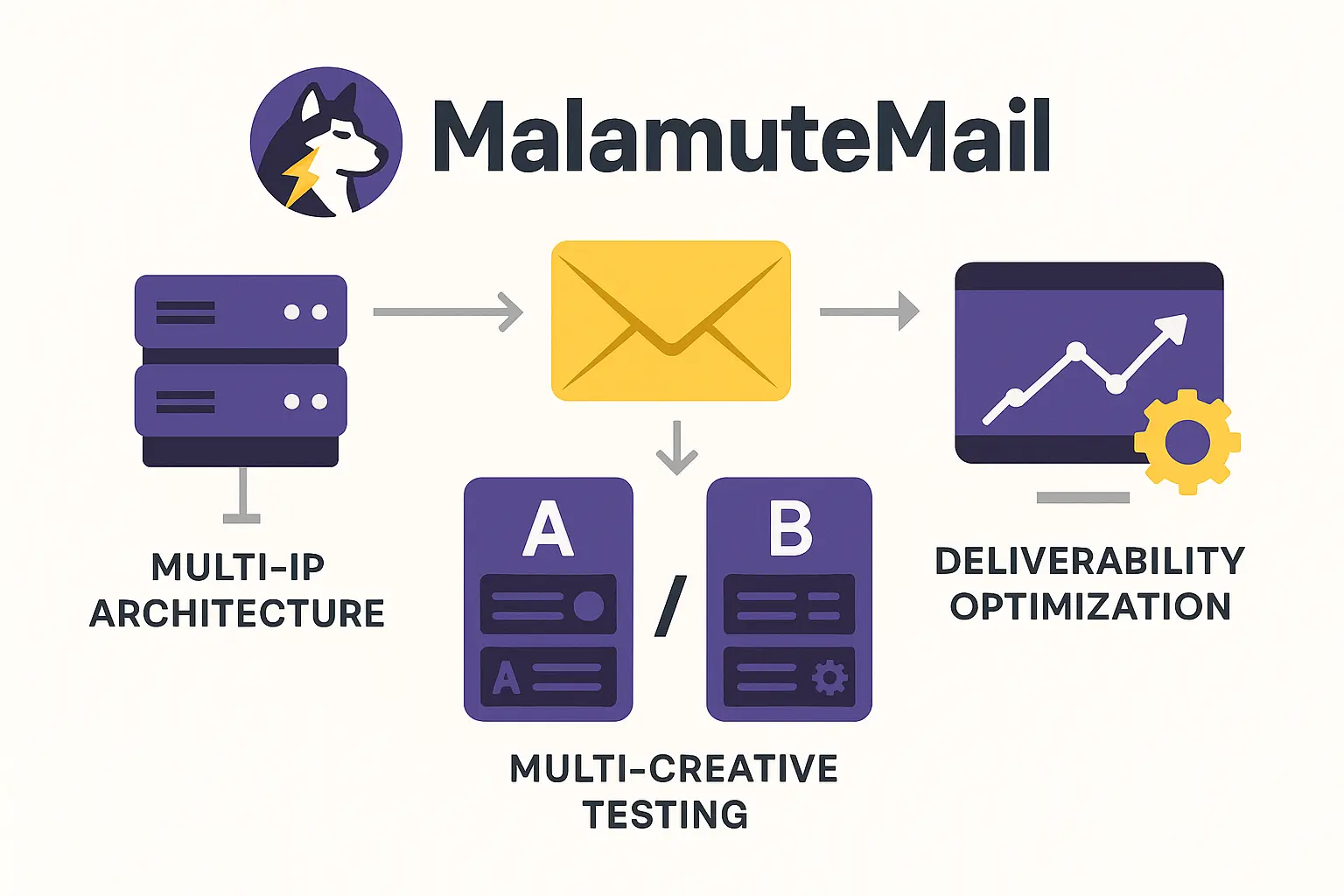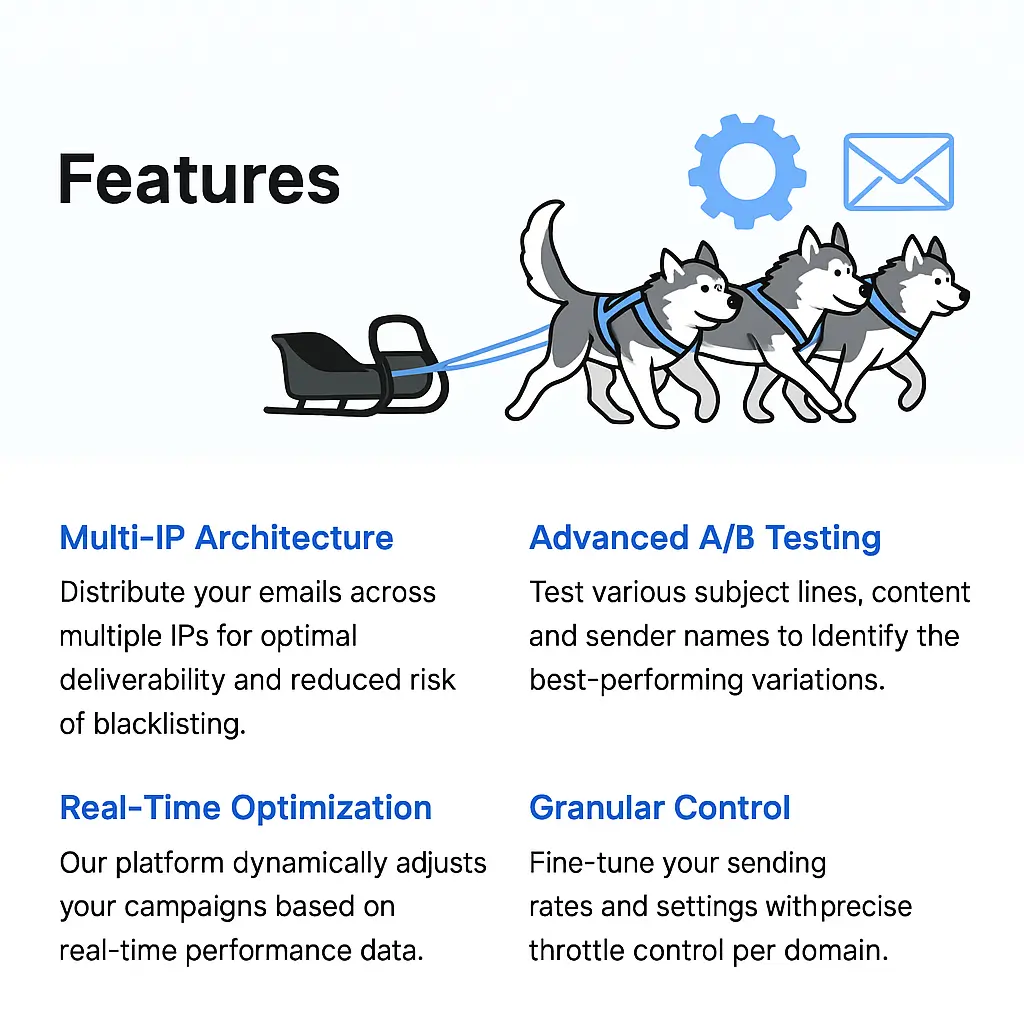 Malamute Mail is a high-performance bulk email delivery system built for marketers who need reliable infrastructure, smart optimization, and automated A/B testing
